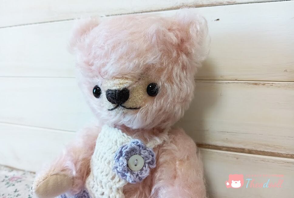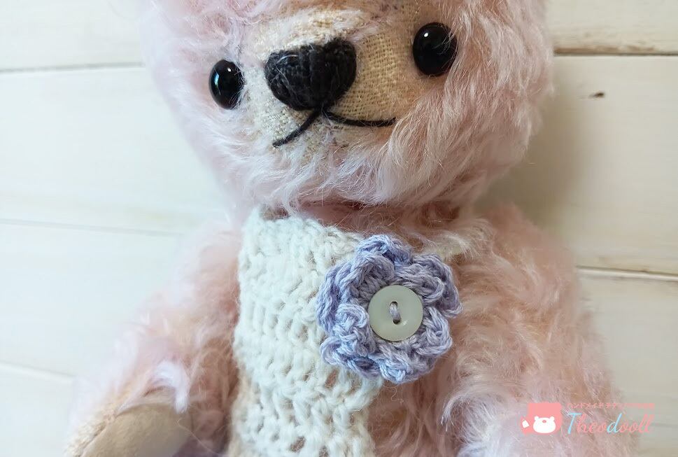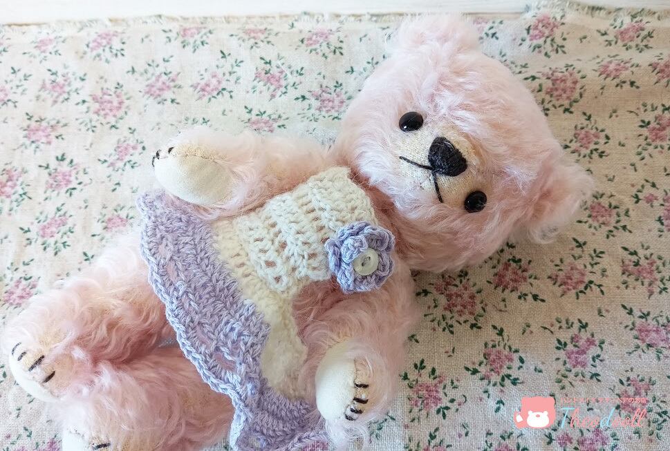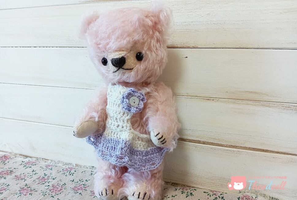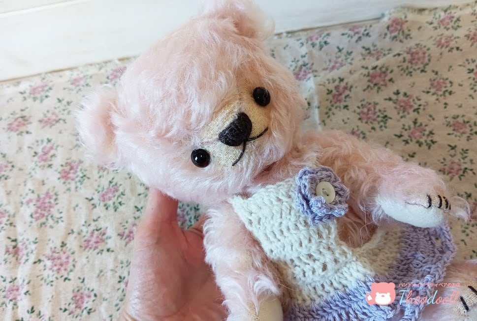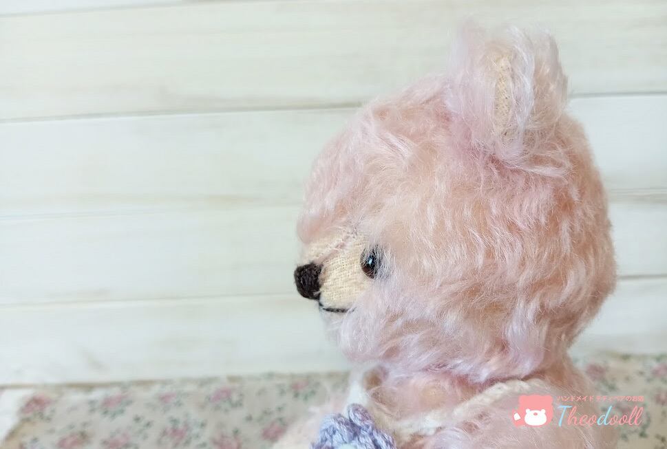 ピンク色のやわらかな毛並みにまん丸の顔からあふれる優しさ。つぶらな瞳はに思わず微笑んでしまいます。ふわふわのカールモヘアは触れると感じるやさしさが魅力的。手編みのワンピースでおめかししました。この子を抱きしれば心がほっと落ち着くはず。リラックスしたい時にぴったりの存在です。どうぞおそばに置いて心安らぐ時間をお過ごしください。
