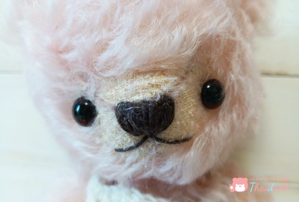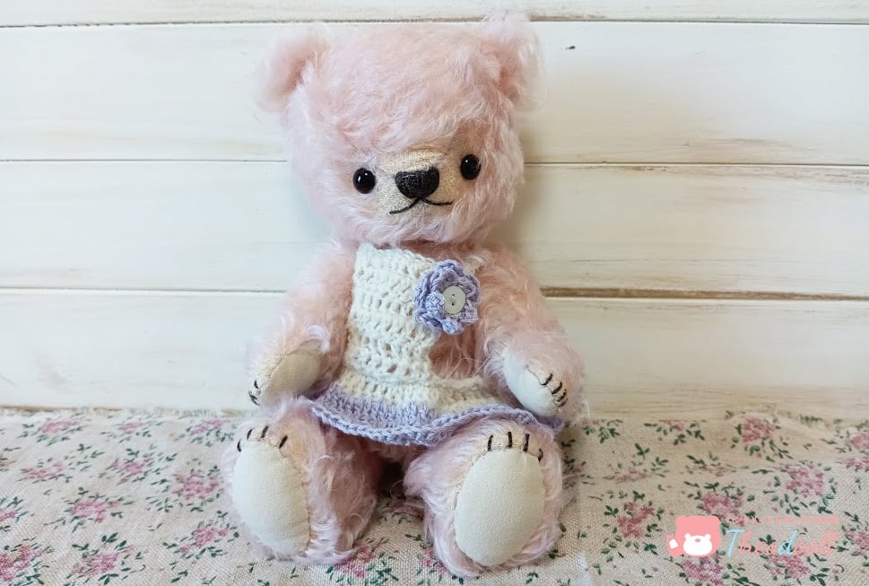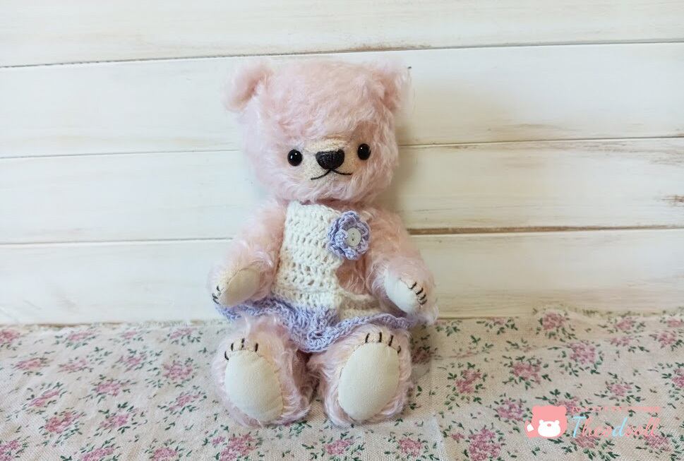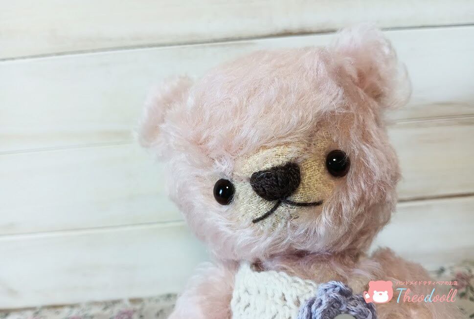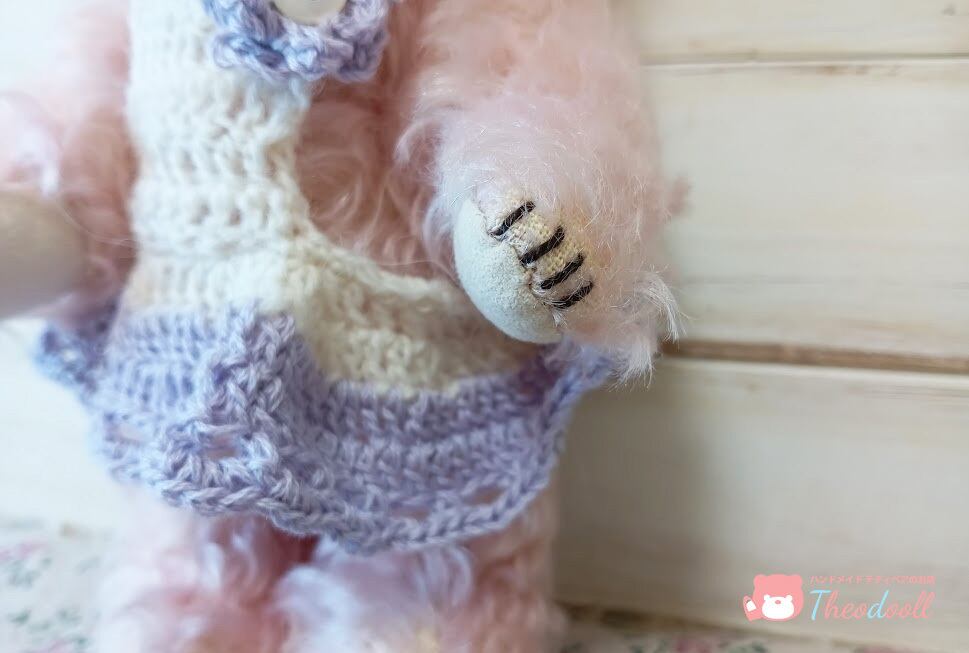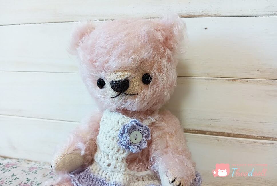 ピンク色のやわらかな毛並みにまん丸の顔からあふれる優しさ。つぶらな瞳はに思わず微笑んでしまいます。ふわふわのカールモヘアは触れると感じるやさしさが魅力的。手編みのワンピースでおめかししました。この子を抱きしれば心がほっと落ち着くはず。リラックスしたい時にぴったりの存在です。どうぞおそばに置いて心安らぐ時間をお過ごしください。