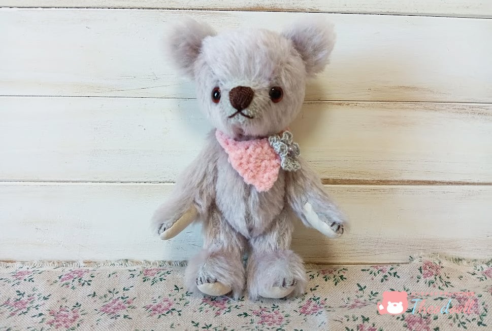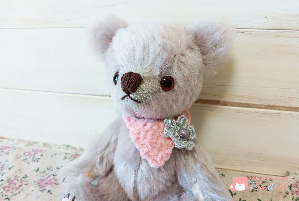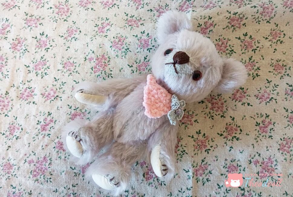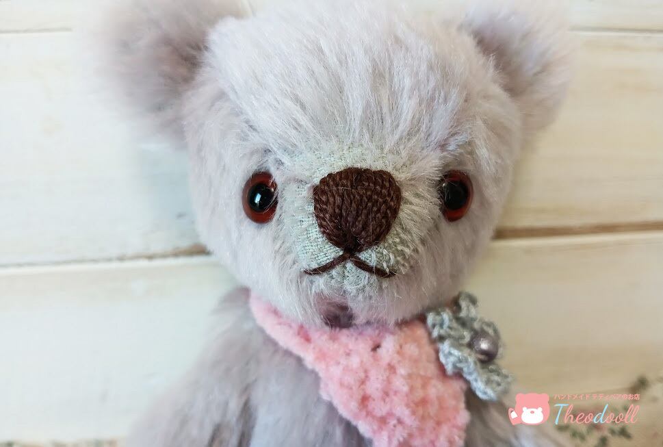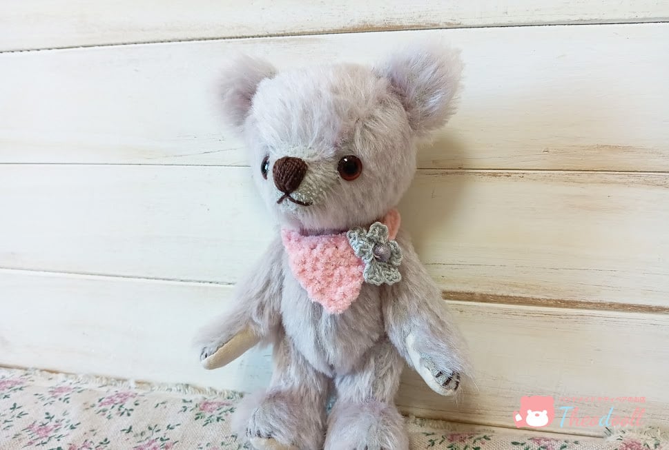 ラベンダー色で、手のひらにぴったり収まるサイズのくまさん。お出かけにも一緒に連れて行けるサイズです。