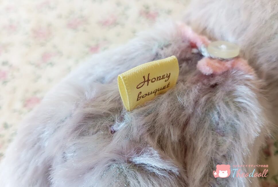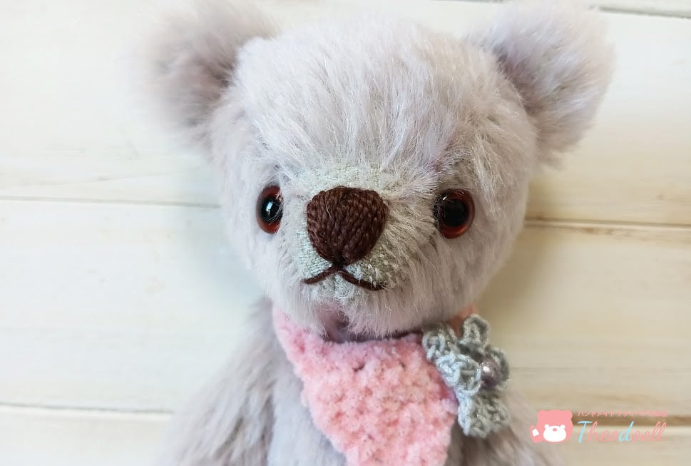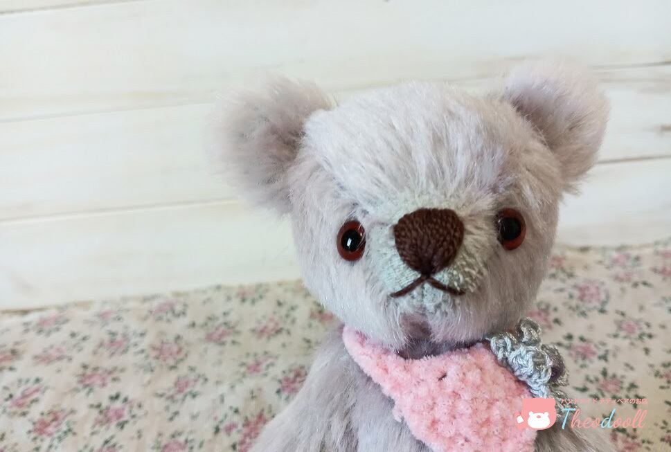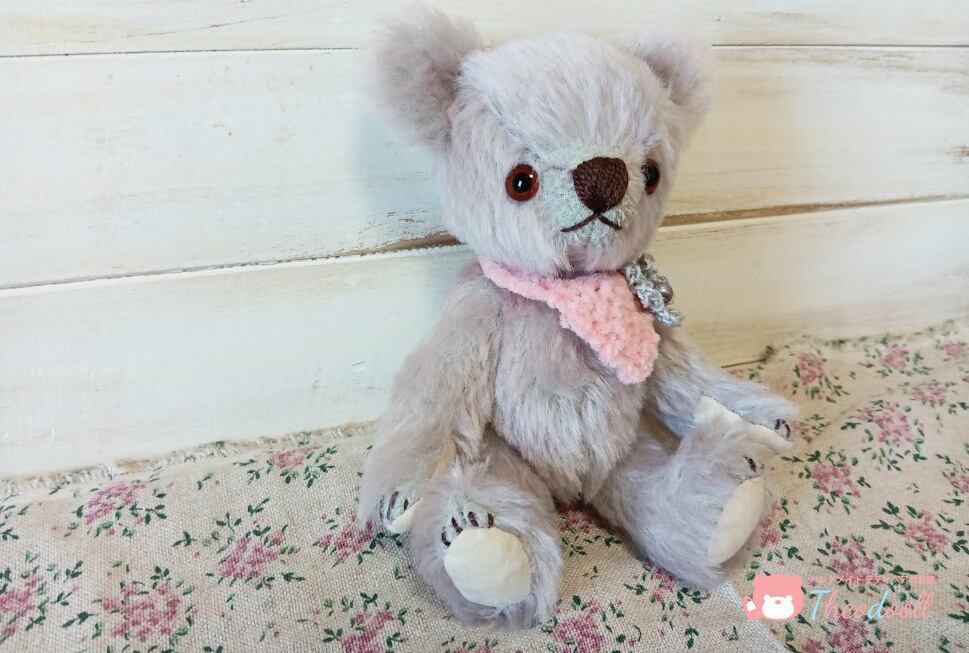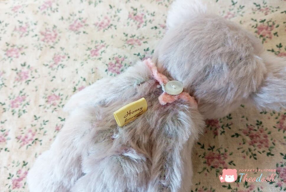 ラベンダー色で、手のひらにぴったり収まるサイズのくまさん。お出かけにも一緒に連れて行けるサイズです。