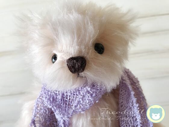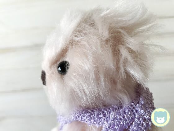 涼しく爽やかな薄いピンク色のモヘアです。首には薄い紫色のストールを巻いています。ストールにはアクセントに桃の花のチャームをつけています。