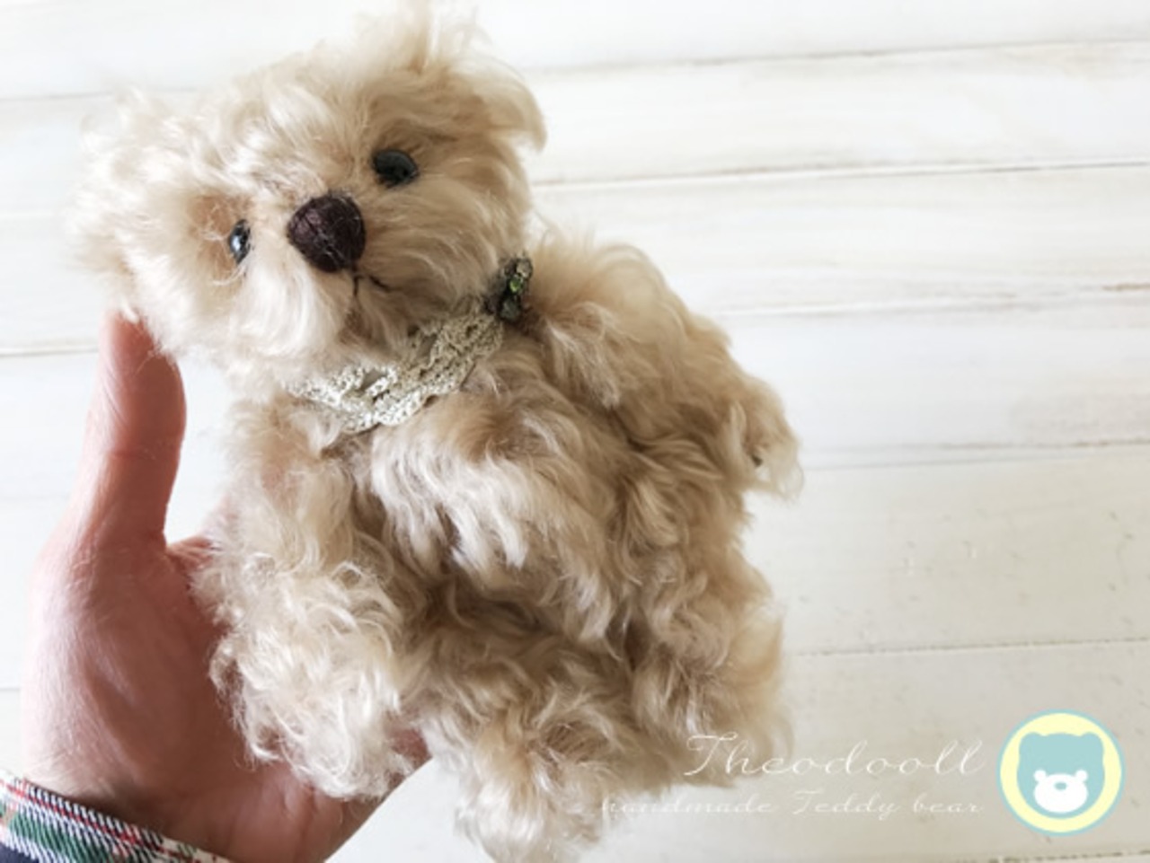 モヘアは上質ならではの光沢と質感、色は薄いベージュです。カールモヘアなのでボリュームもあります。首にはビーズを重ねた立体的にした花のブローチが印象的です。ふわふわなベアです。