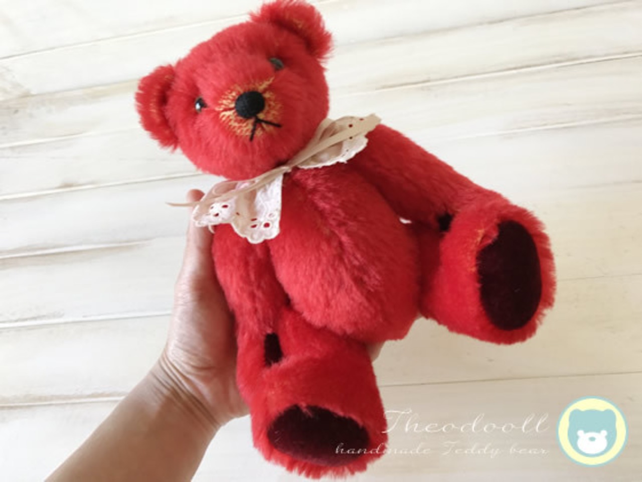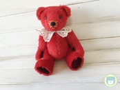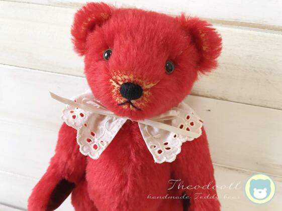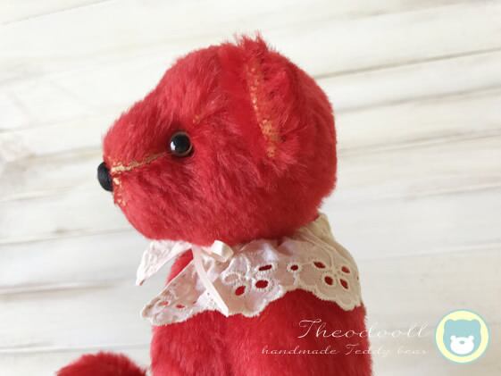 りんごのような赤いテディが出来上がりました。お腹にステンレスボールが入っているので、おすわりも安定感があります。