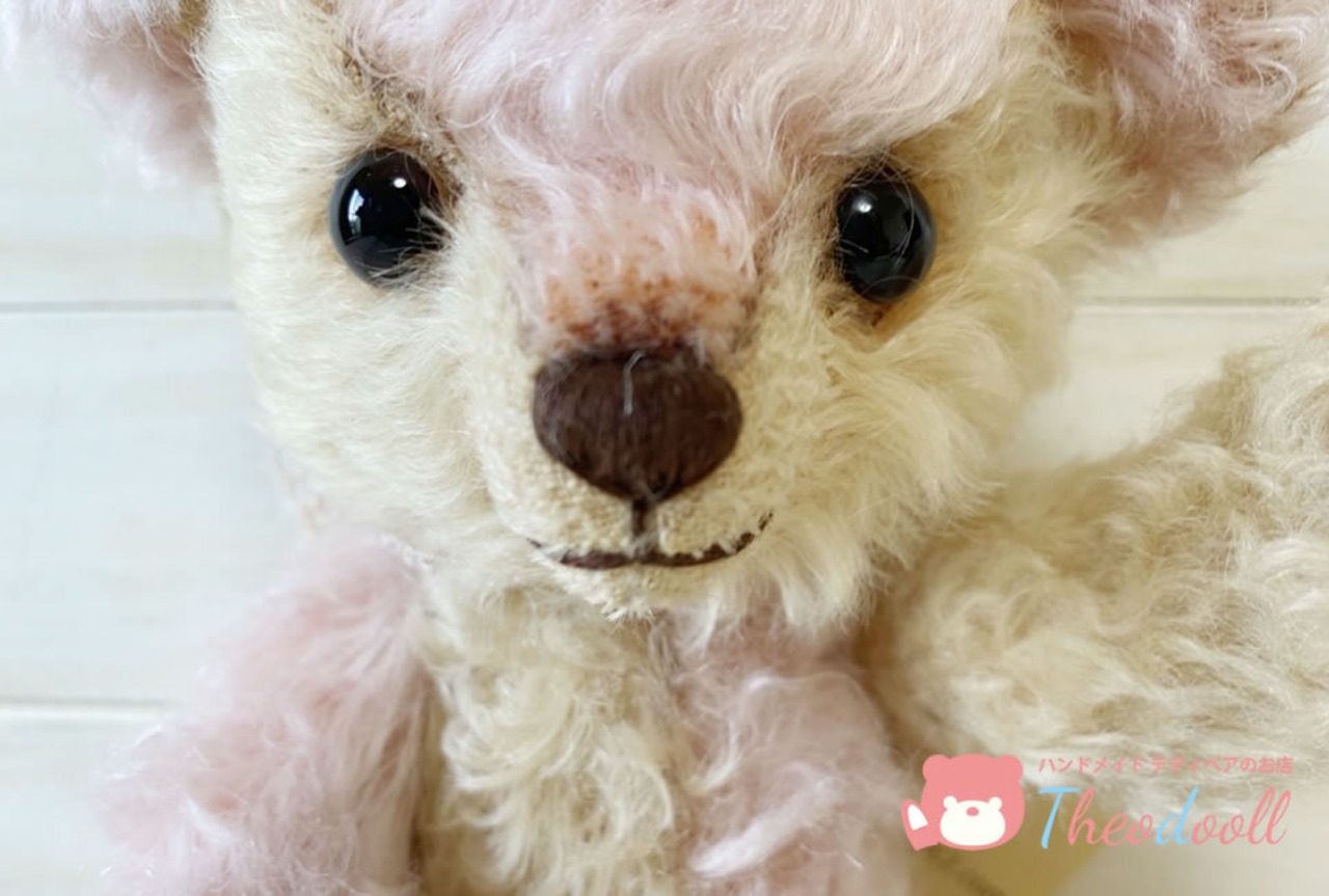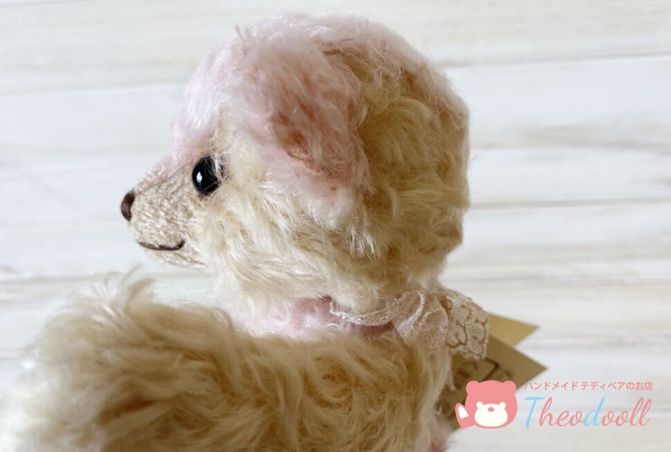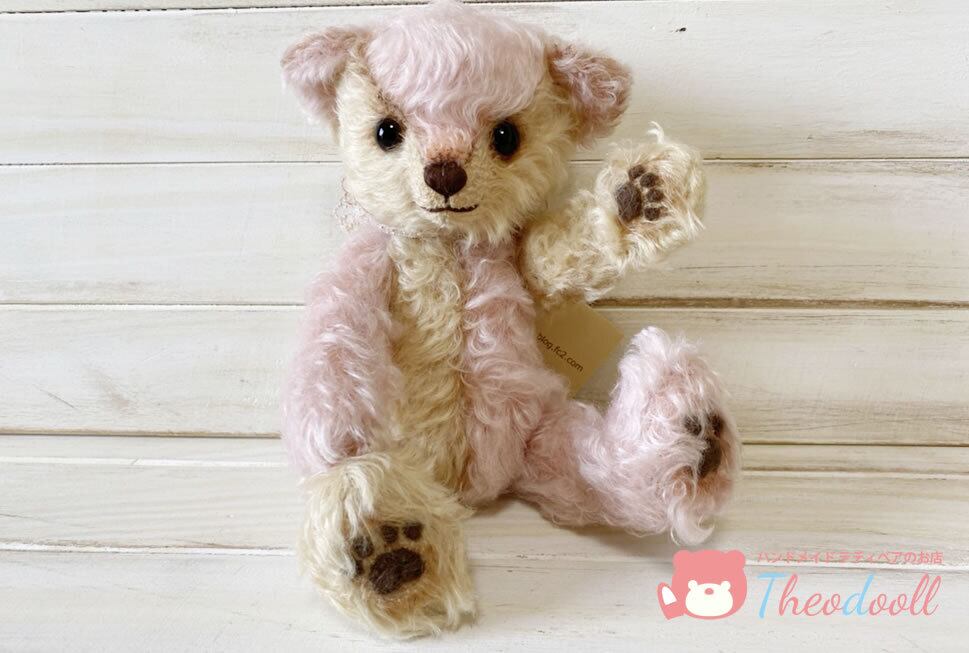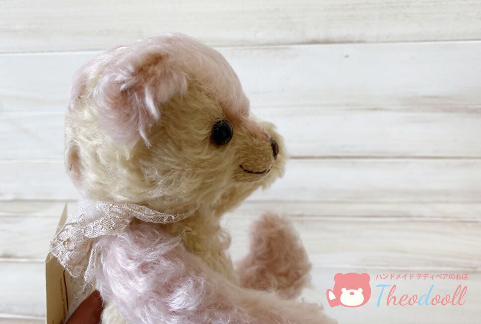 やさしいピンクとイエローのモヘアに、茶色の着色を加えてクラシックな雰囲気を醸し出しています。ちょっぴり大人っぽいくまぽんです。