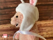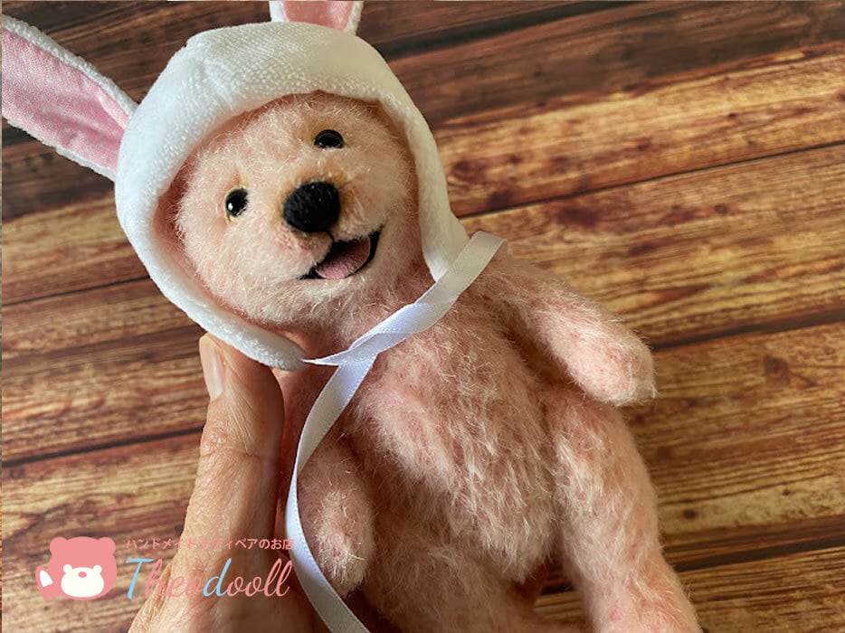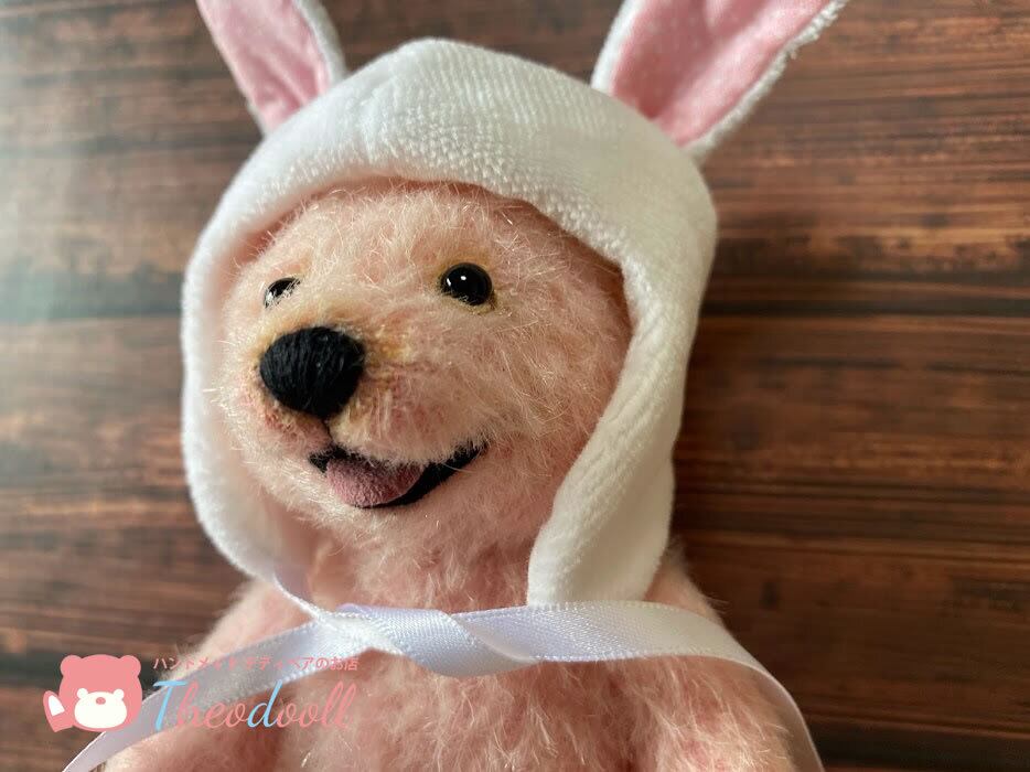 にっこり笑顔のオープンマウスベアです。ふわふわのうさ耳帽子をかぶって気分はすっかりうさぎさん♪♪