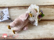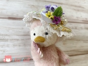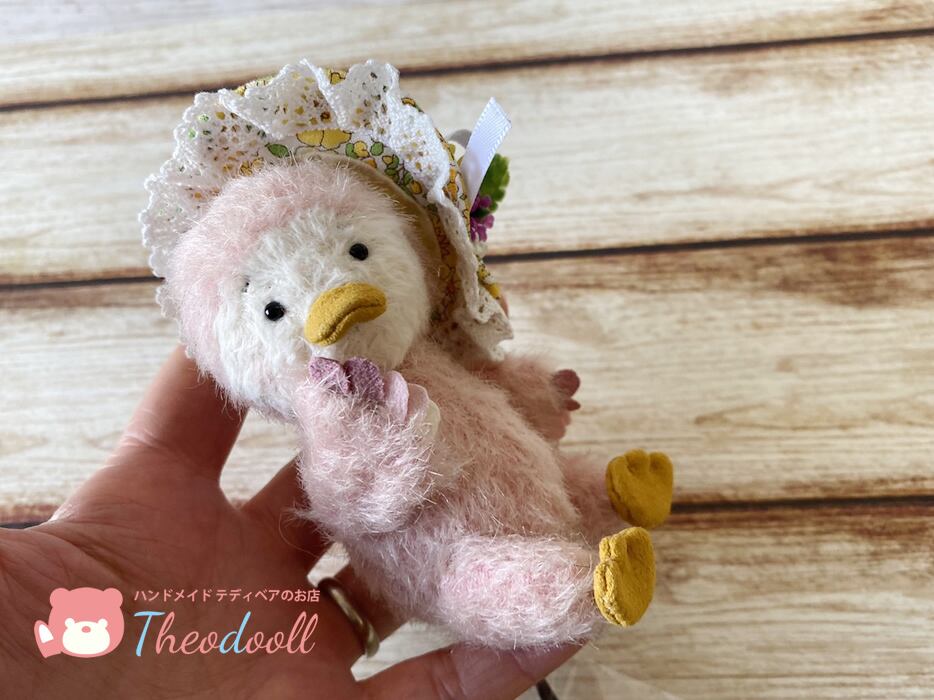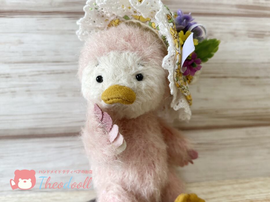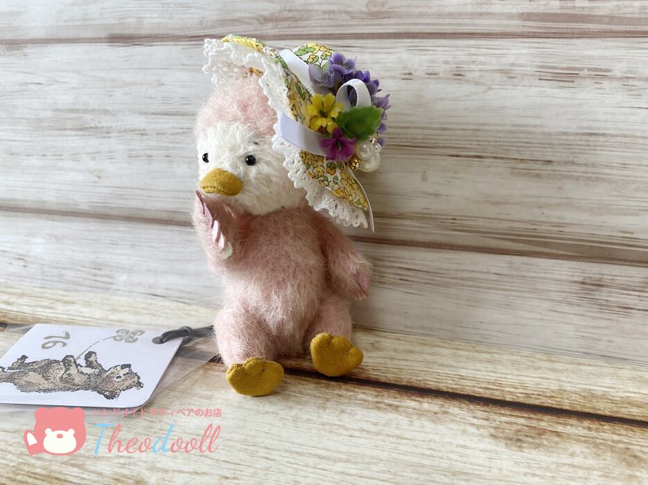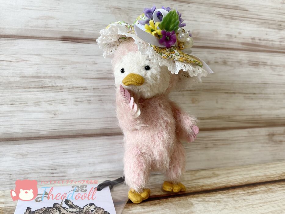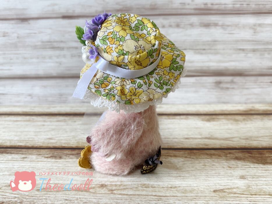 お花飾りの帽子でご機嫌のピヨちゃんです。紛失防止の為、帽子は軽く糸で止めております。お家で糸を切って下さいね。