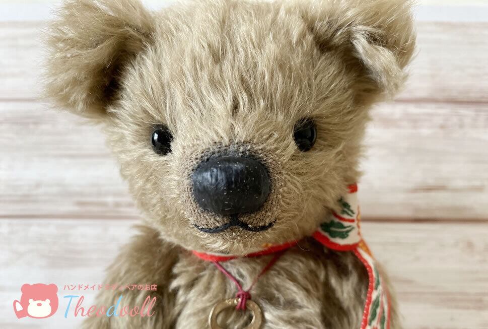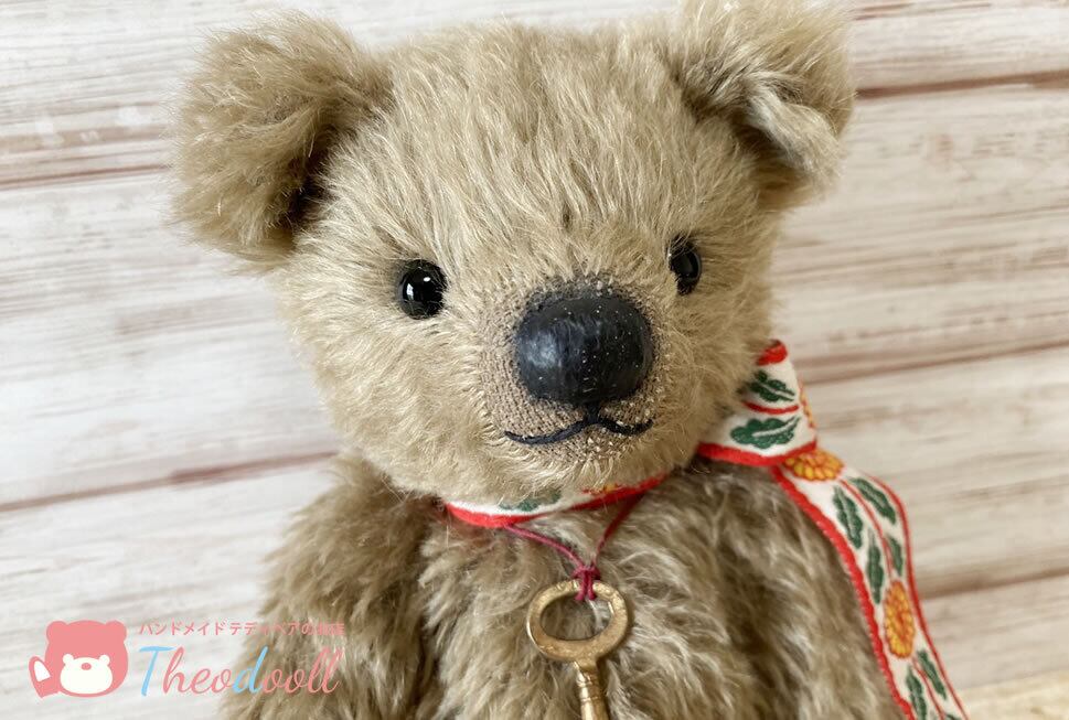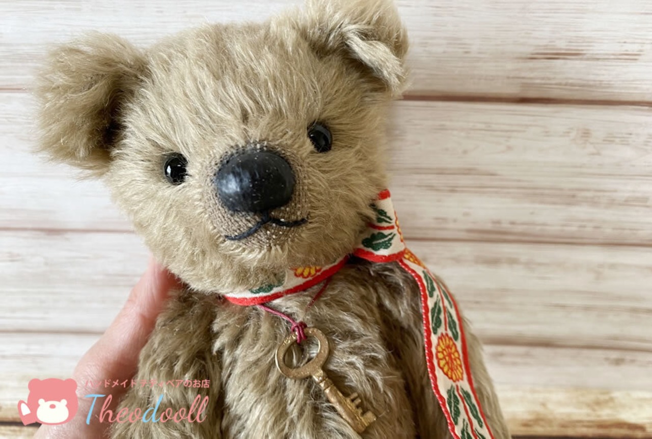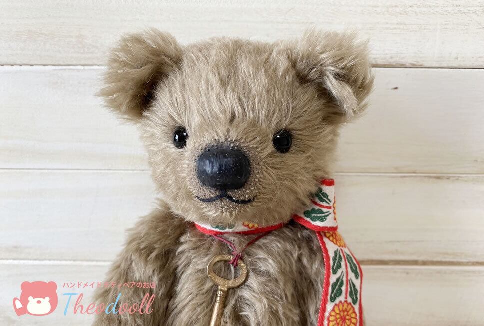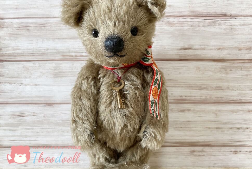 落ち着いたアッシュブラウンのモヘアを使用したセンターシームのベアちゃんです。