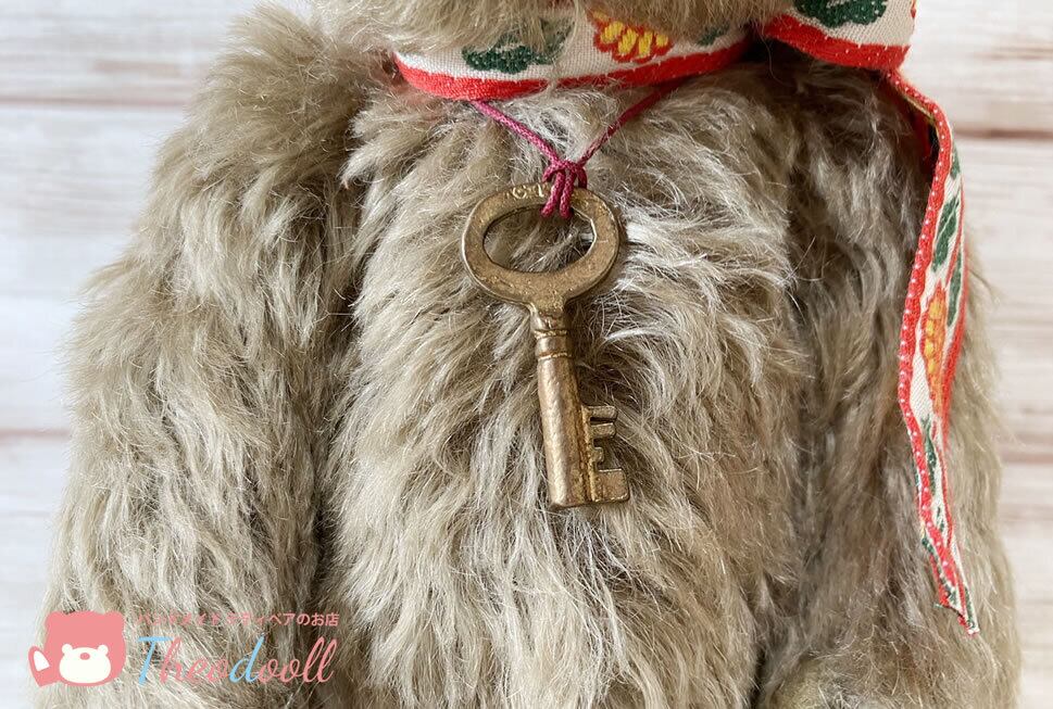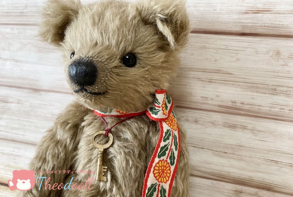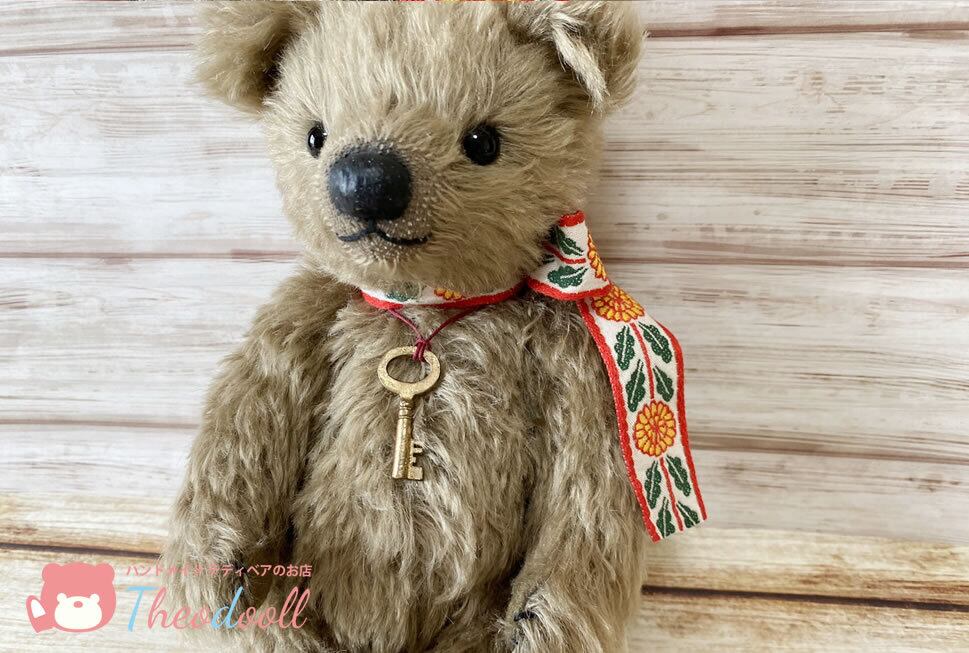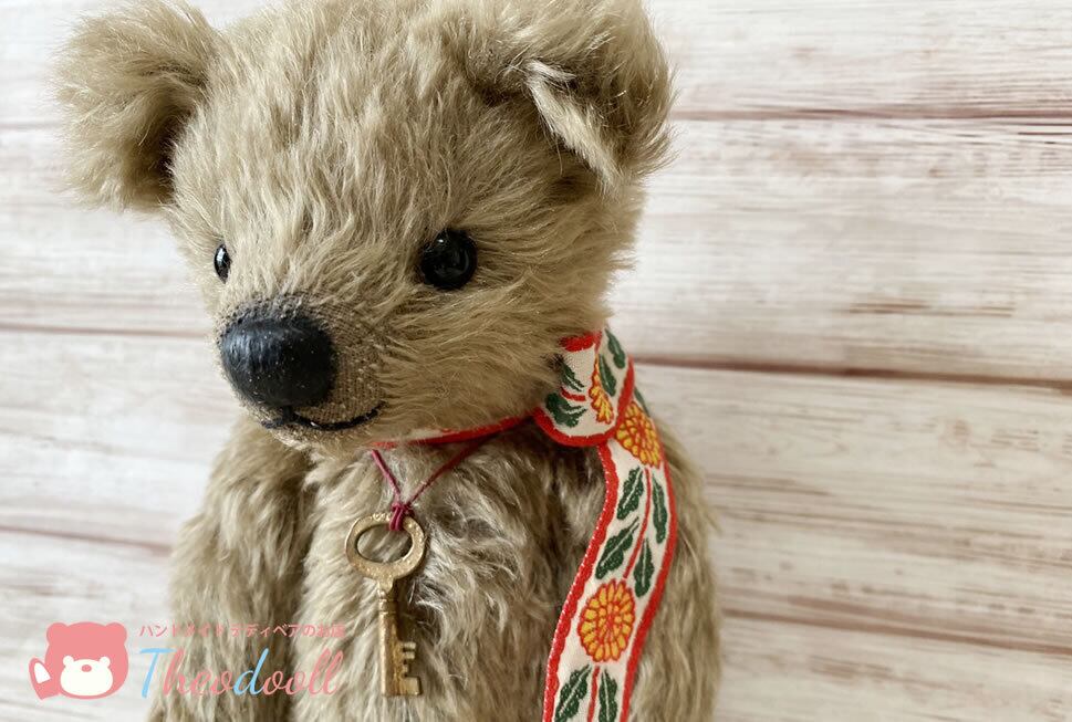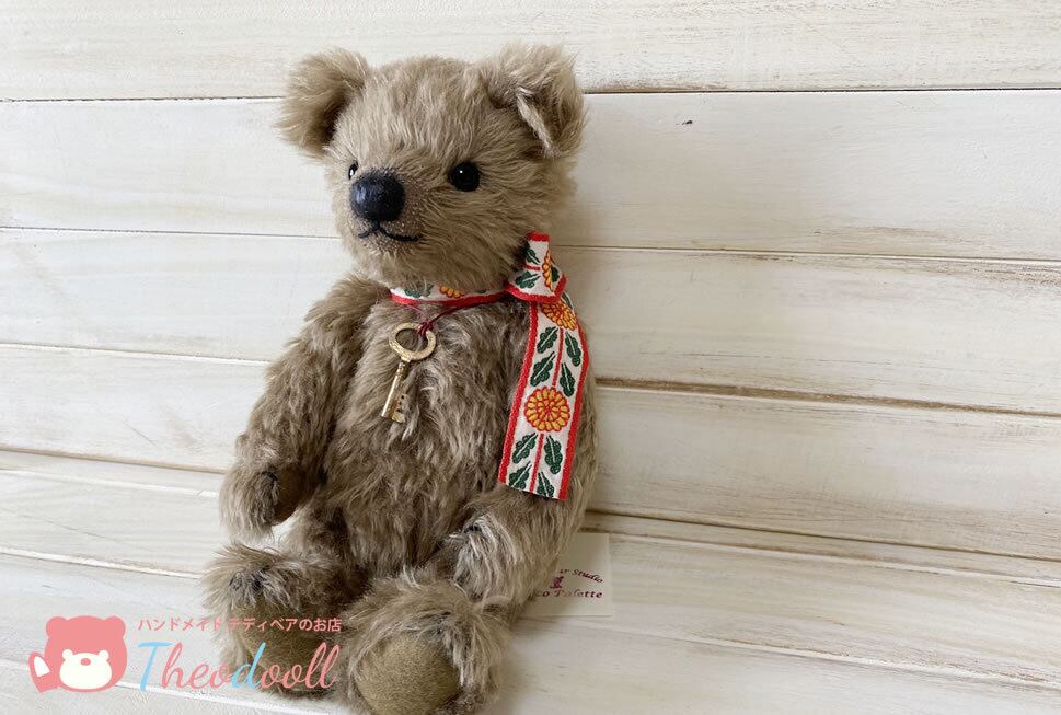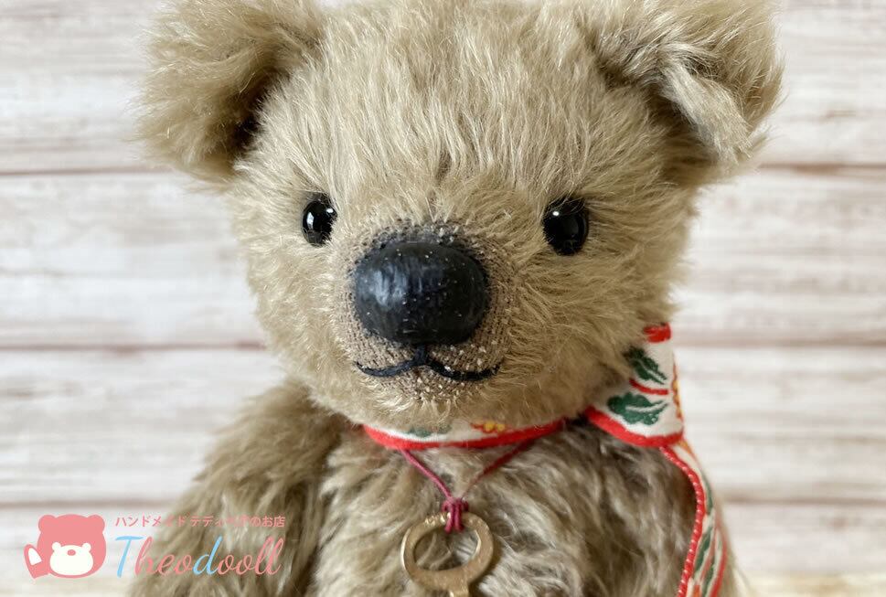 落ち着いたアッシュブラウンのモヘアを使用したセンターシームのベアちゃんです。